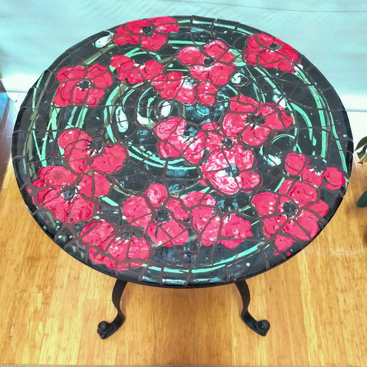 Tile Topped Wrought Iron Table - Black with Red Poppies
