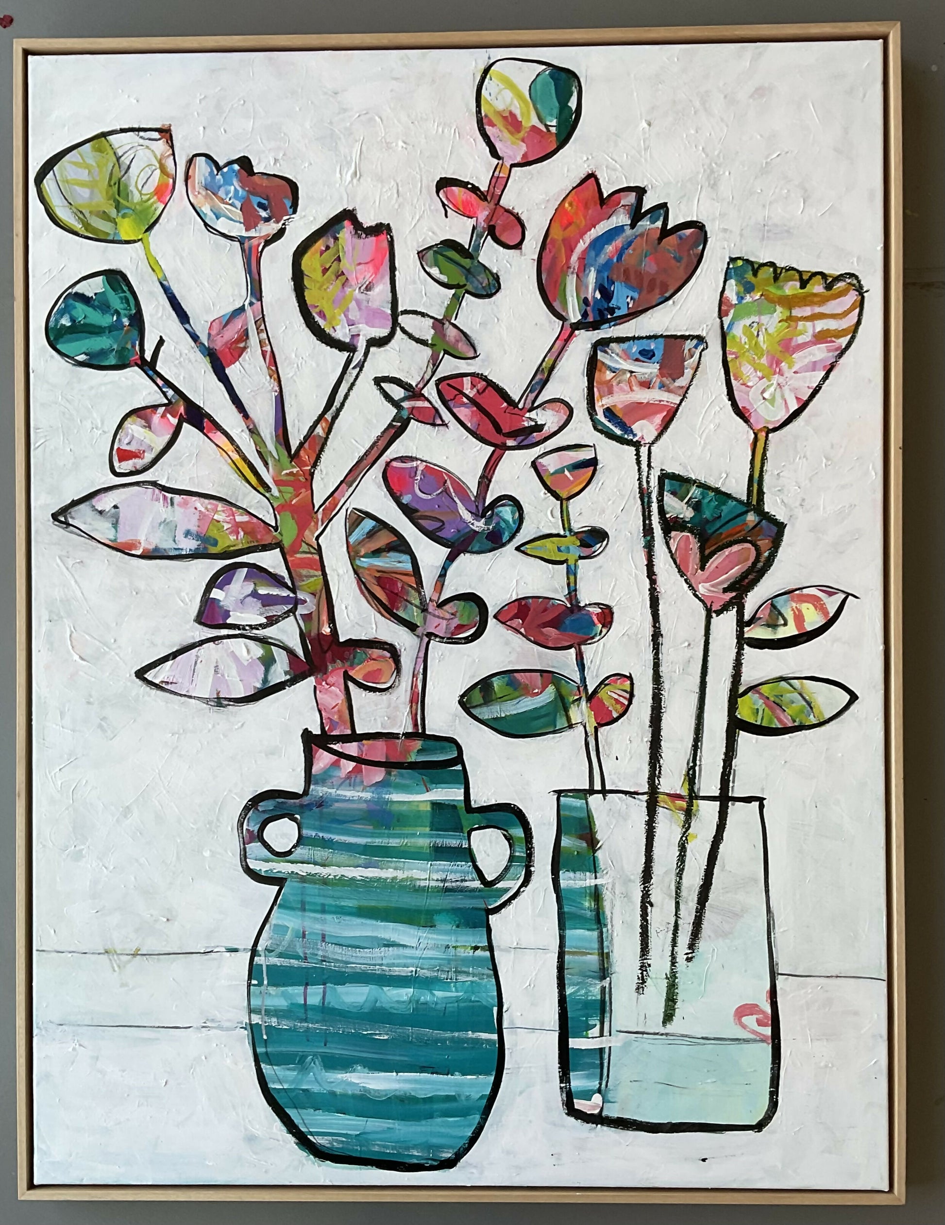 Claudia is a playful and expressive exploration of colour, pattern, and form. I wanted to capture the beauty of simplicity — two vases filled with abstract, joy-filled blooms that seem to dance with life. The bold outlines and textured white background make the vibrant colours within each petal and leaf pop, creating a sense of movement and spontaneity. The mix of organic shapes and structured vessels reflects balance — between chaos and calm, freedom and form. Claudia is acrylic paint on framed canvas. 1200x900