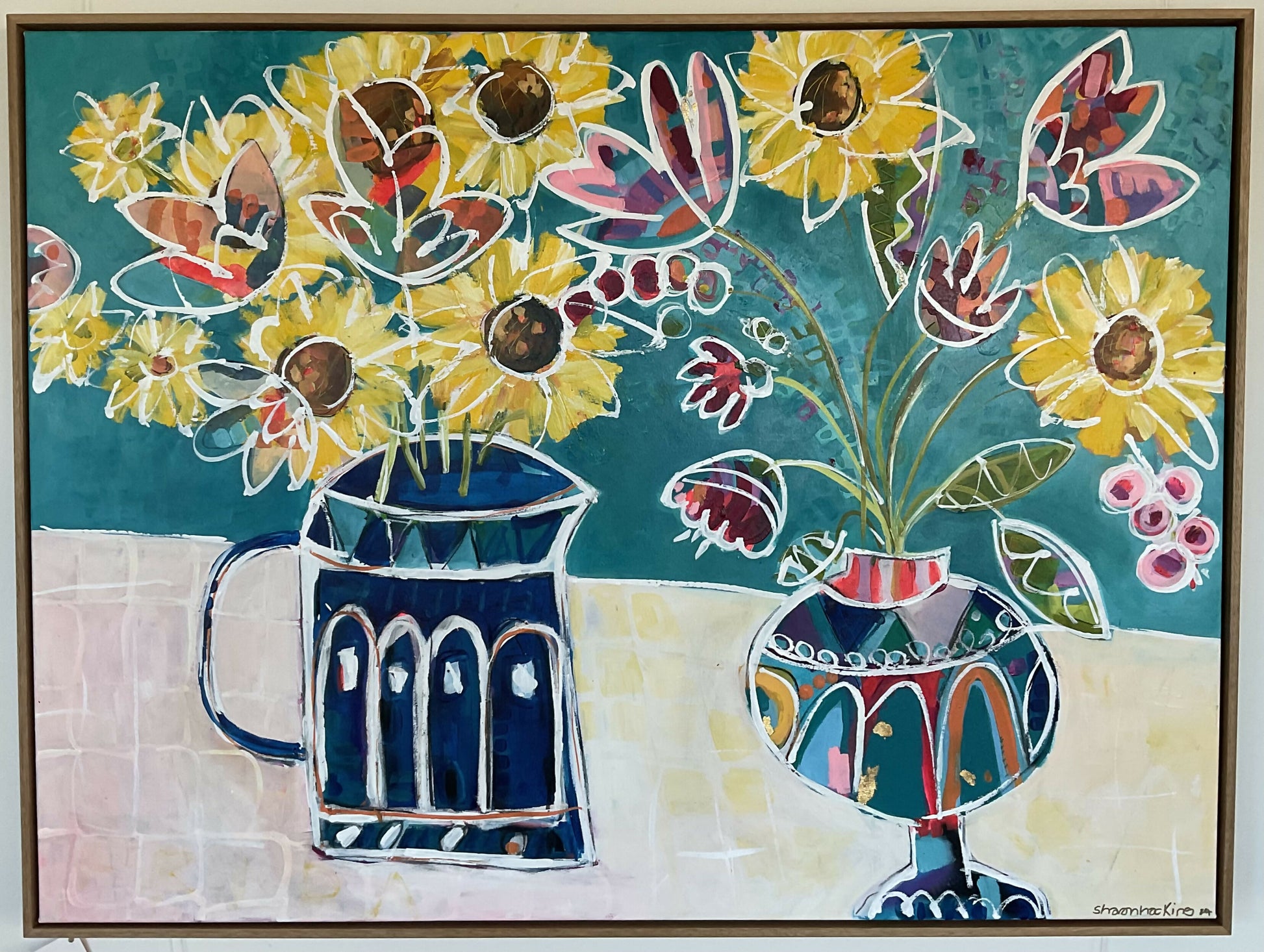 My painting “Frida” was inspired by the Frida Kahlo exhibition in Bendigo and captures the vibrant spirit and emotion that her work evokes. I used bold outlines, playful geometric patterns, and a lively mix of teal, yellow, coral, and navy to create energy and movement. The two patterned vases overflowing with sunflowers and abstract floral shapes symbolise life, resilience, and creativity. The underpainting colour and shapes add to the details of the vase and flowers. FRIDA is acrylic paint on framed canvas. 1200x900